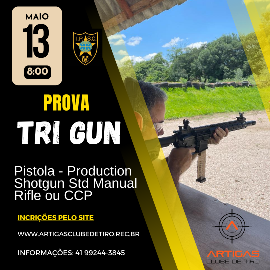 No dia 13/05, foi realizada a 1ª Prova TRI GUN, para que os competidores pudessem experimentar suas habilidades com 3 armas diferentes na mesma pista. A prova era composta de 22 disparos totais, sendo 8 de Rifle ou CCP, 5 de Espingarda e 9 de arma curta. Foi bem interessante ver os competidores, que estão normalmente acostumados a disparar com apenas 1 arma por pista, apurarem a técnica e a concentração para o manuseio e disparo com carabina, espingarda e arma curta, em um mesmo percurso. Para a organização foi gratificante inovar e apresentar algo desafiador e emocionante, com o extremo cuidado com a segurança a todo momento.